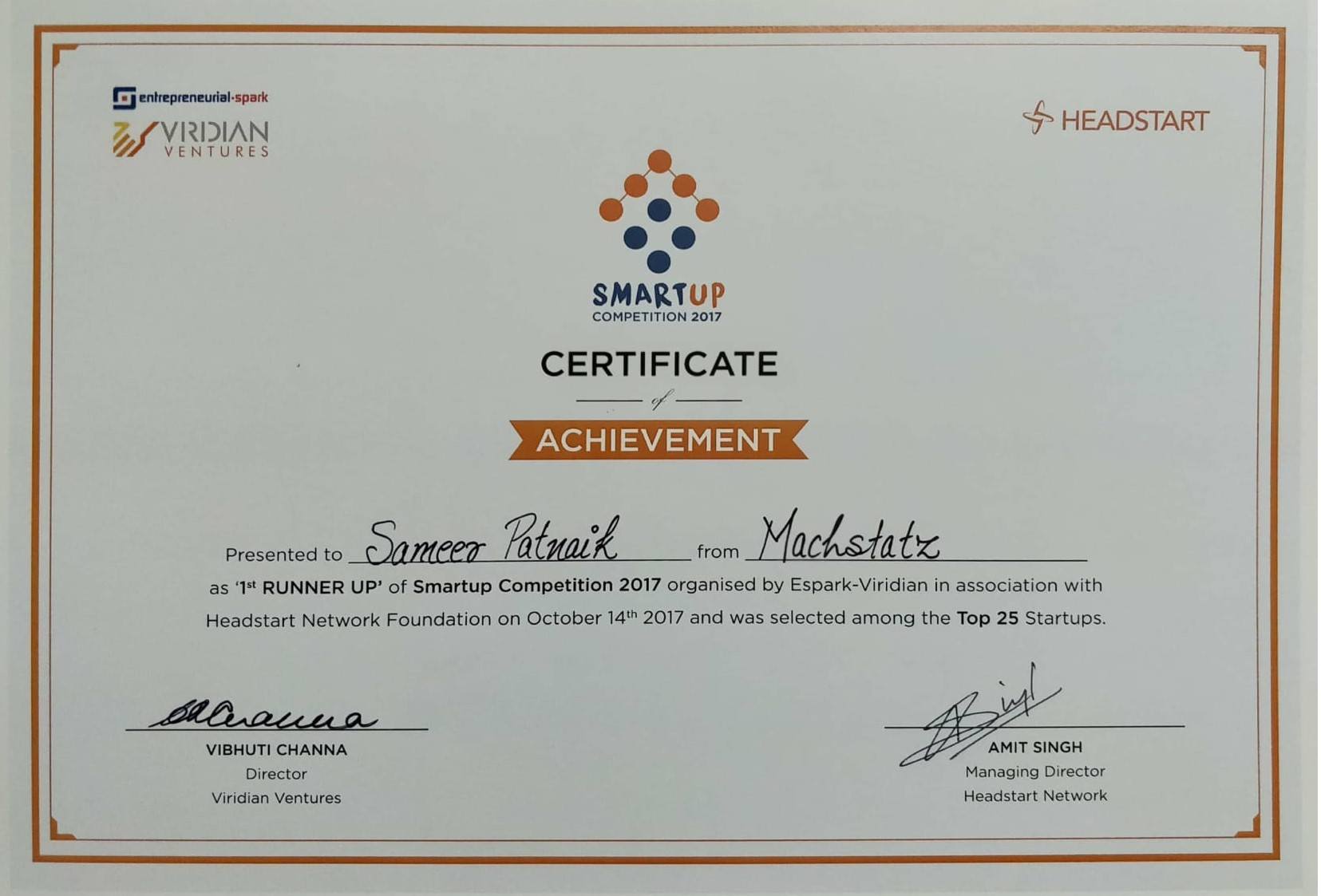 Machstatz won 1st Runner’s Up award for a PAN India Business Plan Contest organized by UK based accelerator E-Spark , Viridian Ventures & Headsart.
