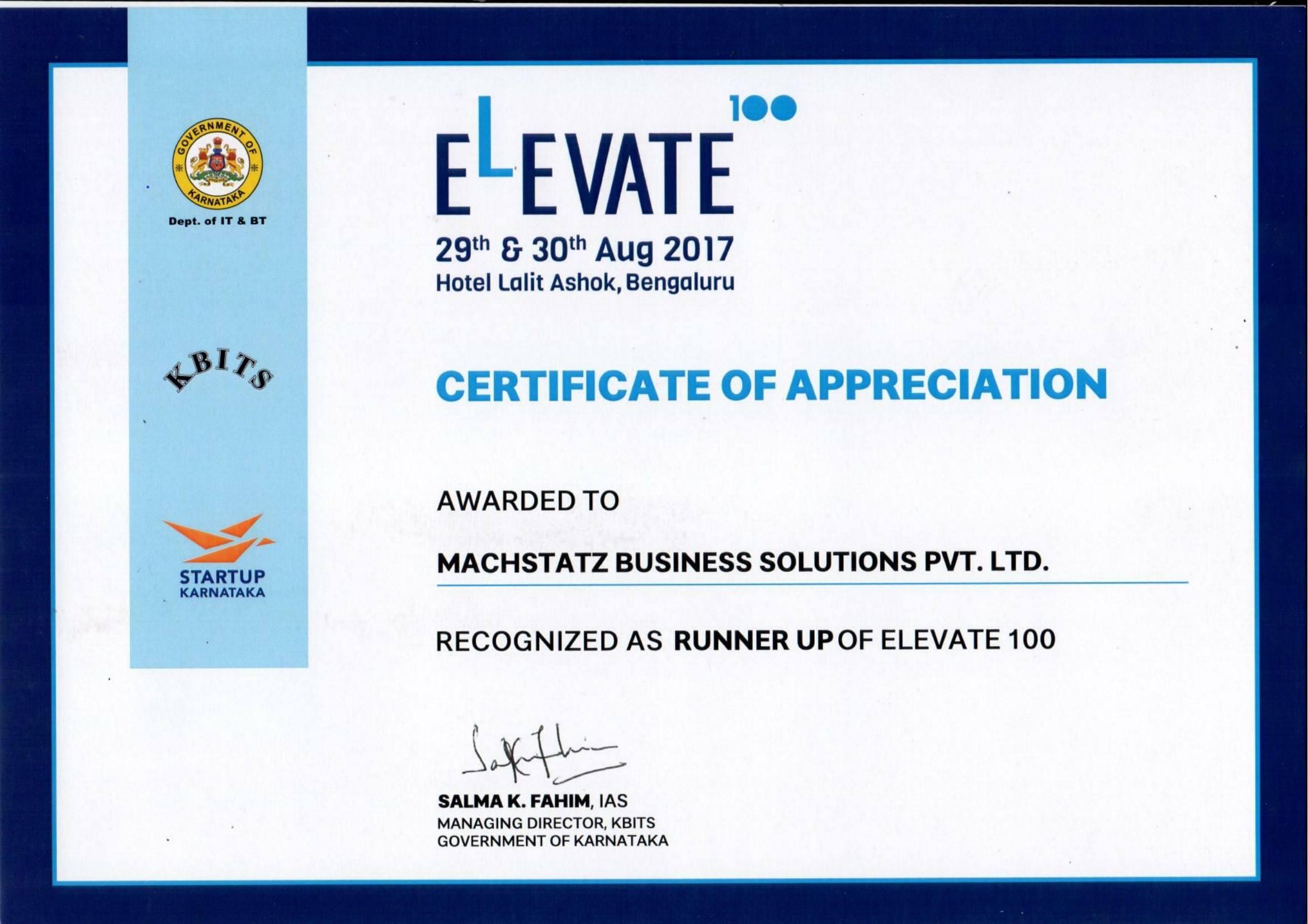 Machstatz was Runner’s Up for Elevate100 event organized by Government of Karnataka. ELEVATE 100, an initiative of the Department of Information Technology and Biotechnology, Government of Karnataka aims to provide a comprehensive entrepreneurship platform for startups.